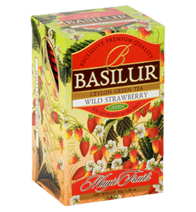 Green tea in double chamber tea bags with individual foil sachet/envelope, from the high grown elevations of Ceylon, with flavours wild strawberry.